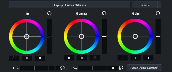 Colour correction is achieved using the industry standard Lift, Gamma and Gain controls as described below: