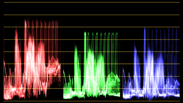 The red green and blue channels will typically look quite similar. In this example however, we can see the highlights (top of each waveform)