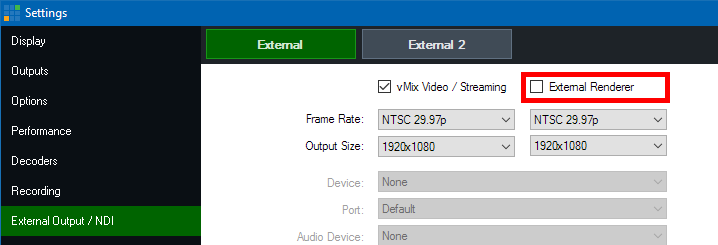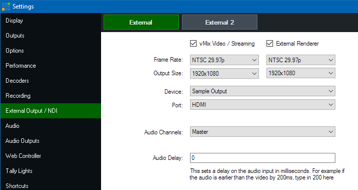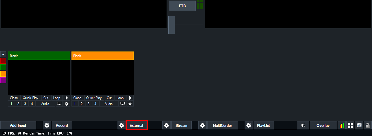 4. Click the External Button on the bottom right hand corner of the screen next to the Cog Button. The output of vMix should now appear on your external display.