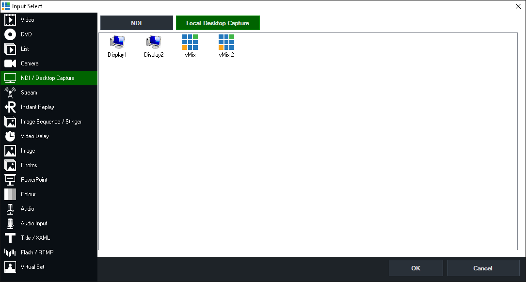 From the NDI / Desktop Capture tab, a tab called Local Desktop Capture can be selected to capture the screen or window from the same computer.