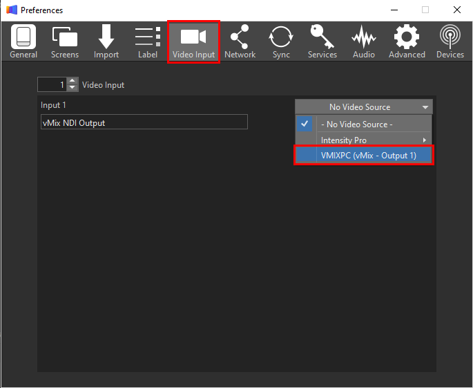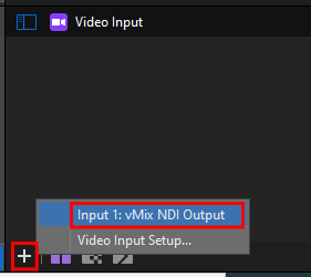 Select the Video Input tab. From the dropdown menu to the right, select the vMix NDI Output option. It will have your computer name followed by vMix - Output 1. EG. YOURPCNAME - (vMix - Output 1). Give your input a name in the field to the left to help you identify it. Close this window.
