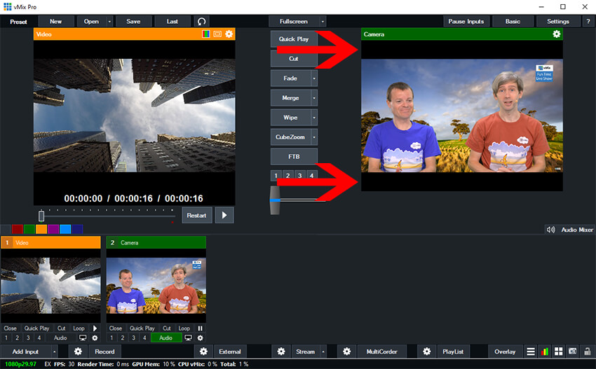 In the below example, the Inputs, Preview and Output windows all look more square and as a result there are black bars that appear above and below anything that is widescreen in vMix. Such as a 1920 x 1080 video or camera input.