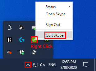 When receiving these errors, firstly make sure all other programs are closed and then try clicking the Retry button. If it still shows the same error, then this means that not all programs have been closed properly. Applications that may stop the installation from occurring include any that use cameras. As well as applications like Skype, Zoom and Chrome. You may need to quit programs such as Skype from the Windows task tray to ensure they have been quit completely:
