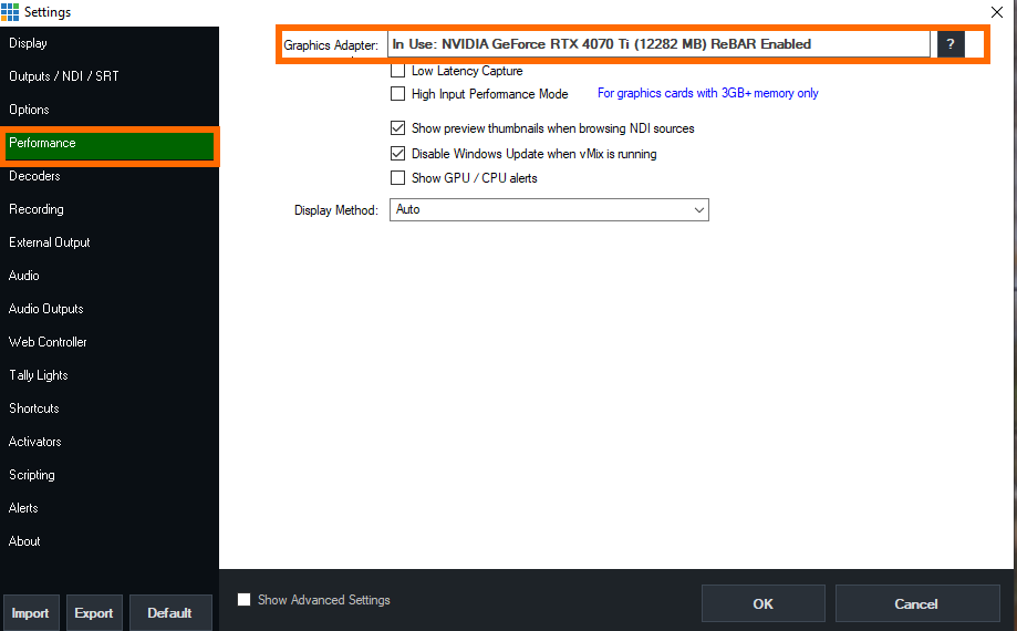 In vMix 28 and later, you should also be able to see if you have ReSizable BAR (ReBAR) enabled in the Settings>Performance Tab. Look for ReBAR Enabled in the Graphics Adapter section.