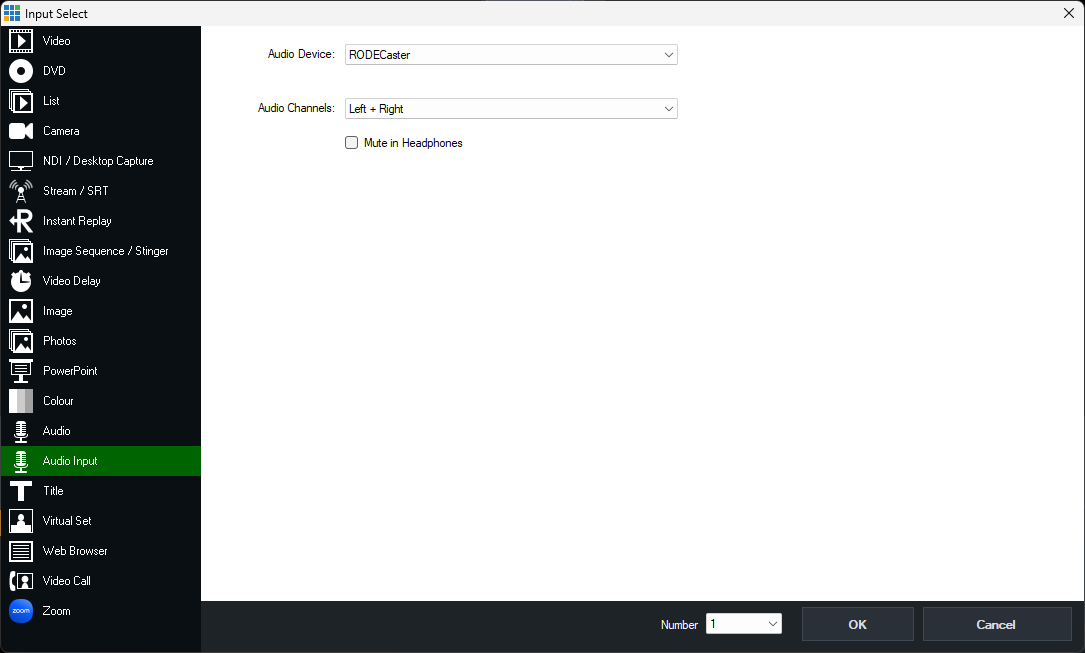 Step 3. You should now be able to add your individual microphones, Bluetooth input and sound effect channel into vMix. To do this, open vMix and then click on [Add Input], then select the [Audio Input] section, and then from the ‘Audio Device’ dropdown list, select RODECaster and select the Audio channels you wish to add first. If you only see numbers, such as 1+2, rather than descriptive channels, then the device is not connected to vMix and may still be in use elsewhere.