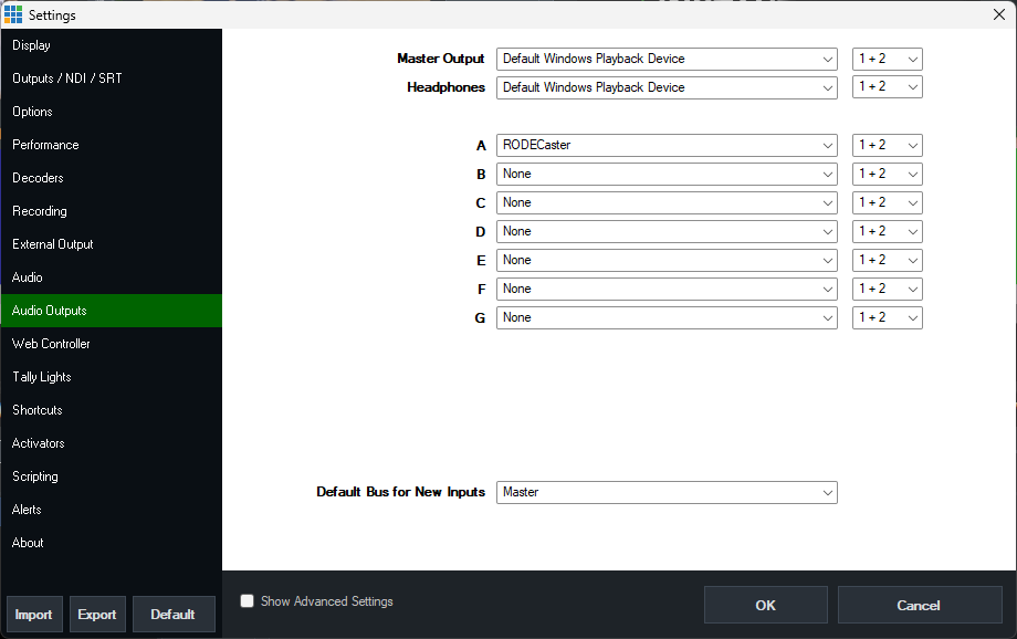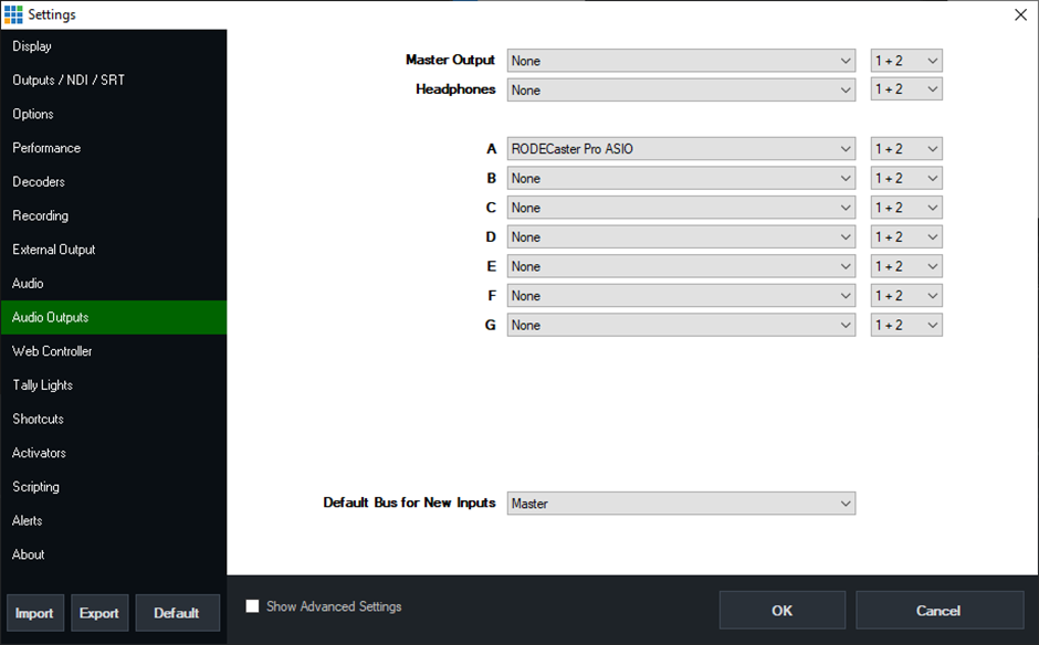 Step 4. To send audio from vMix to the RODECaster Pro II. Click on [Settings] in vMix, then [Audio Outputs], then set a spare Bus to output via RODECaster. In the below example Bus A has been selected.