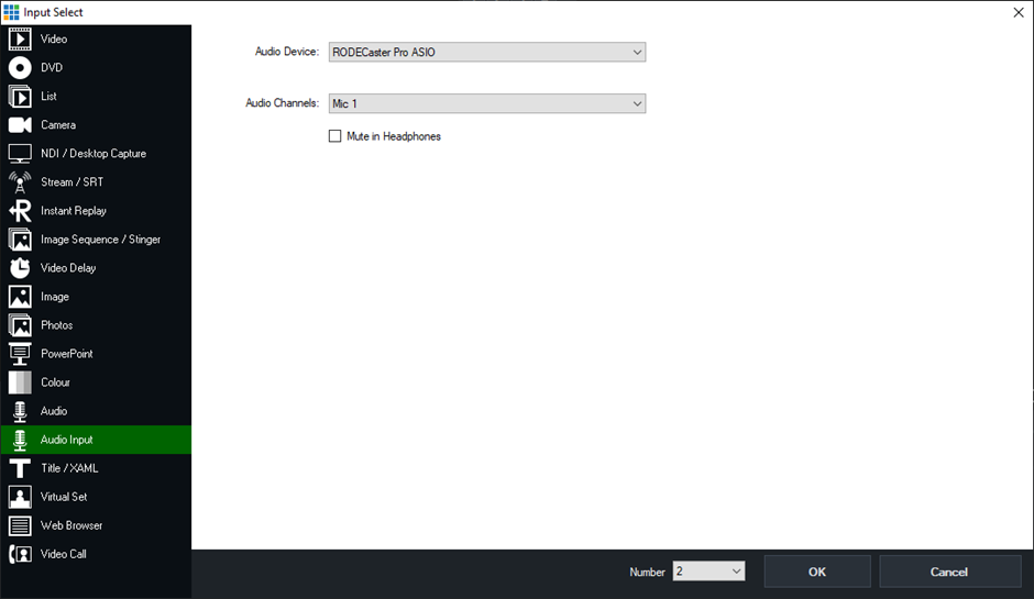 Step 2. With the above settings, you should be able to add your individual microphones, Bluetooth input, sound effects, etc into vMix. To do this, open vMix and then click on [Add Input], then select the [Audio Input] section, and then from the ‘Audio Device’ dropdown list, select RODECaster Pro ASIO.
