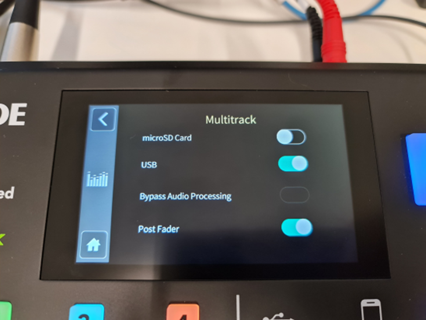 Once you have installed the firmware on the RODECaster Pro and installed the ASIO drivers in Windows, then, on the RODECaster Pro touchscreen, go to the [Settings gear icon], then [Advanced], then [Audio], then [Multitrack] and set up the Multitrack features like this: