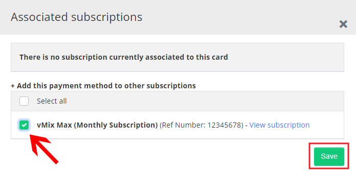 Tick the checkbox next to the subscription you wish to associate this payment method with and click Save.