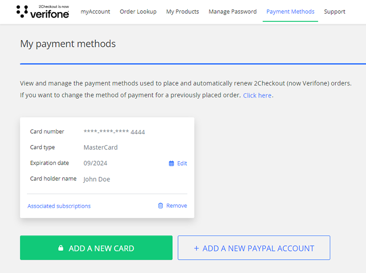 In the below example, we will add a new payment method by clicking the Add a new card button. You can also add PayPal using the Add a new PayPal Account button.