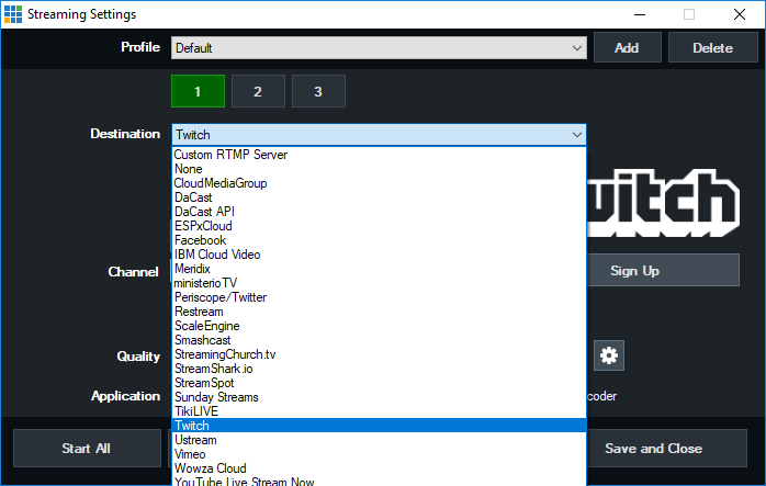 In order to stream to Twitch, you'll first need to open up your Stream settings in vMix. Once there, select Twitch as a destination from the drop down menu.