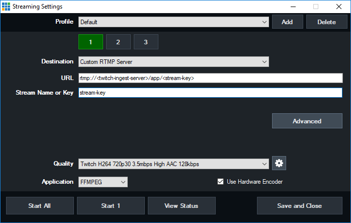 When you are ready to stream click the Start button or Save and Close. You can choose to start your stream by clicking the Stream button in vMix.