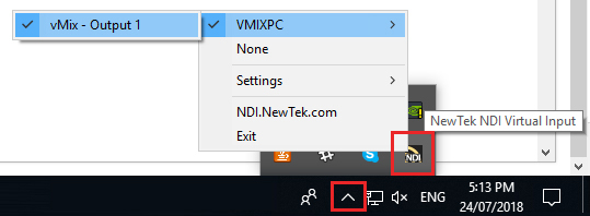 Open the NewTek NDI Virtual Input program that comes installed with the Newtek NDI Tools pack. Once running, click the arrow in the task tray at the bottom right of Windows and right click the yellow and black NDI icon. Select your computer name -> then select vMix - Output 1.