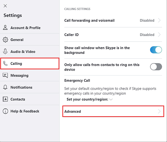 In the new window that appears, select the Calling tab. Then select Advanced.
