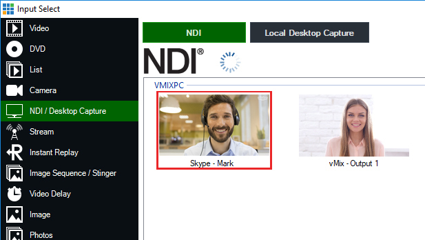 Open vMix and go to Add Input -> NDI / Desktop Capture -> NDI. Then select the Skype NDI input that appears in the list and press Ok.